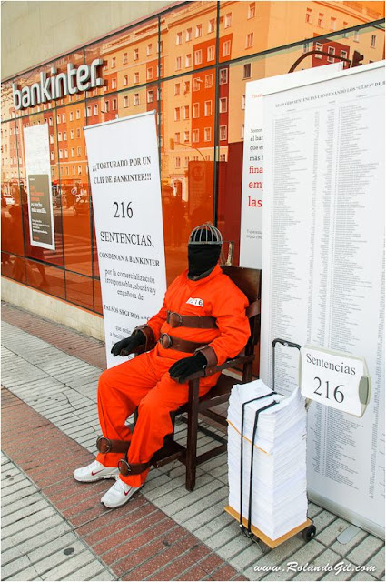 El otro día conocí a José, un buen hombre que por una mala acción de su banco perdió mucho dinero y casi pierde su casa. Su banco le aconsejo que invirtiera en un producto bancario que luego se ha demostrado que es una estafa, con 216 sentencias condenatorias por los juzgados. Eso si, el banco no quiere reconocer su mala gestión y pretende que lo paguen las personas que les confiaron sus ahorros, ellos nunca pierden. Por todo ello José se ha armado de valor y se ha plantado en la puerta del banco reivindicando sus derechos y mostrando a la gente las tácticas fraudulentas de la entidad. Para ello no ha dudado en escenificar una ejecución en la silla eléctrica al puro estilo americano de comienzos del siglo XX. Os dejo con dos imágenes.
