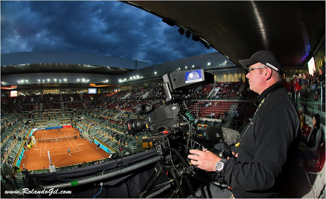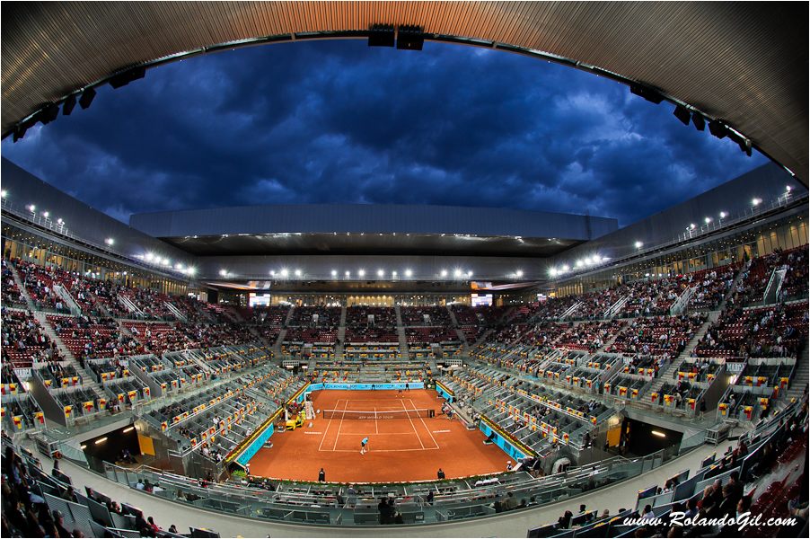 Estos días estoy cubriendo el tenis en la Caja Mágica de Madrid, es el Master Series. Empiezo a tener decenas y decenas de gigas de fotos que habrá que cribar con mucha paciencia y tiempo. Hay cosas interesantes con gestos de tenistas y detalles que voy viendo. Espero poder enseñar unas cuantas fotos la semana que viene, mientras os dejo con una imagen de la pista central de la Caja Mágica, en un momento especial al anochecer con unas nubes muy curiosas. La lastima es que la hice en el partido de Ferrer – Djokovic, el cual gano el serbio eliminando a nuestro tenista.