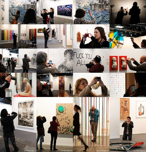 Queridos amigos, he estado en la última edición de la feria de Arte Contemporaneo, ARCO, recientemente clausurada en Madrid. No quiero entrar en la polémica de ¿qué es el arte y a qué se le puede considerar arte?, pues sería relativo y diferente para cada uno de nosotros. Lo que si me ha chocado y mucho es la cantidad de gente con cámaras de fotos, bien sea una compacta, un móvil o una réflex, y todos, absolutamente todos, haciendo fotos sin control ni pudor de cualquier obra de arte expuesta en la feria, hasta el punto de llegar a pensar, que en un momento dado, el autor de la obra echaría a patadas al individuo que intenta plagiar su obra por la cantidad de fotos, generales y de detalle, que ha hecho. Y es aquí donde me surge la pregunta: ¿la gente va a la feria para ver y comprar arte o para darse ideas o simplemente fotografiar una obra de arte y hacer una ampliación en papel colgándola en la pared de su casa? Tal cual corren los tiempos no lo vería tan descabellado. Para muestra un botón, os dejo con un collage de fotos de gente fotografiando ARCO, y que conste que no trato de hacer arte con ello.